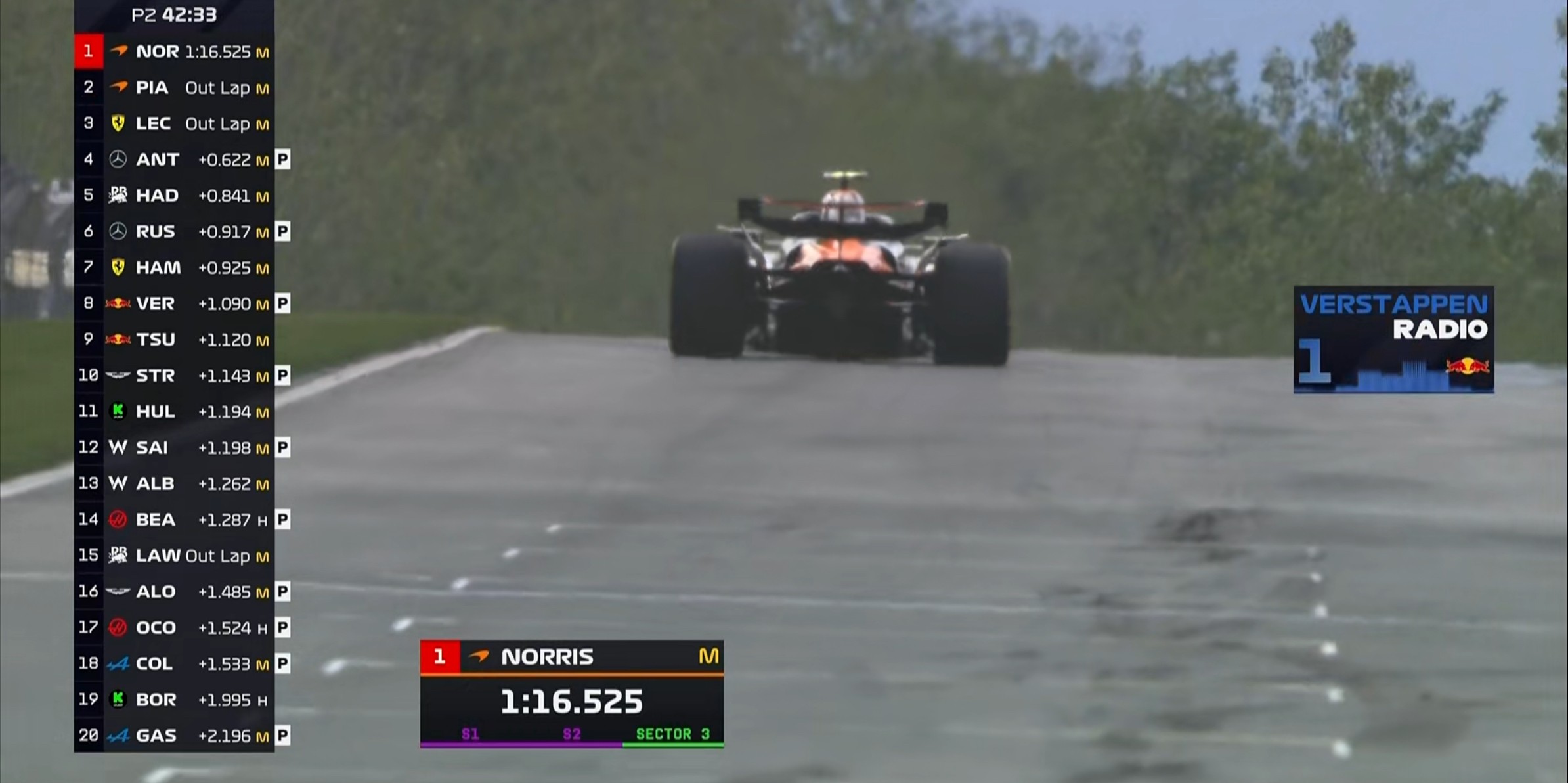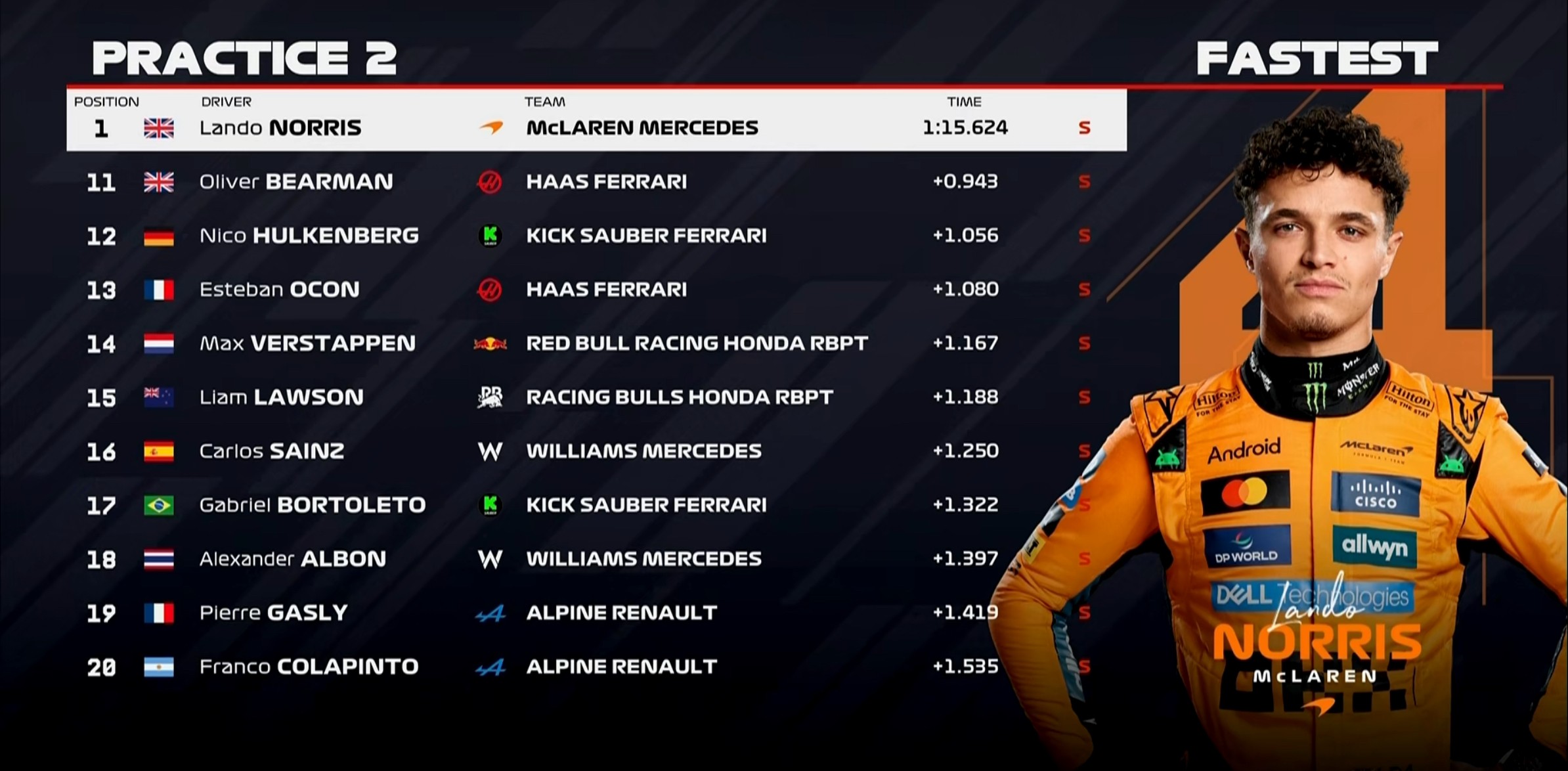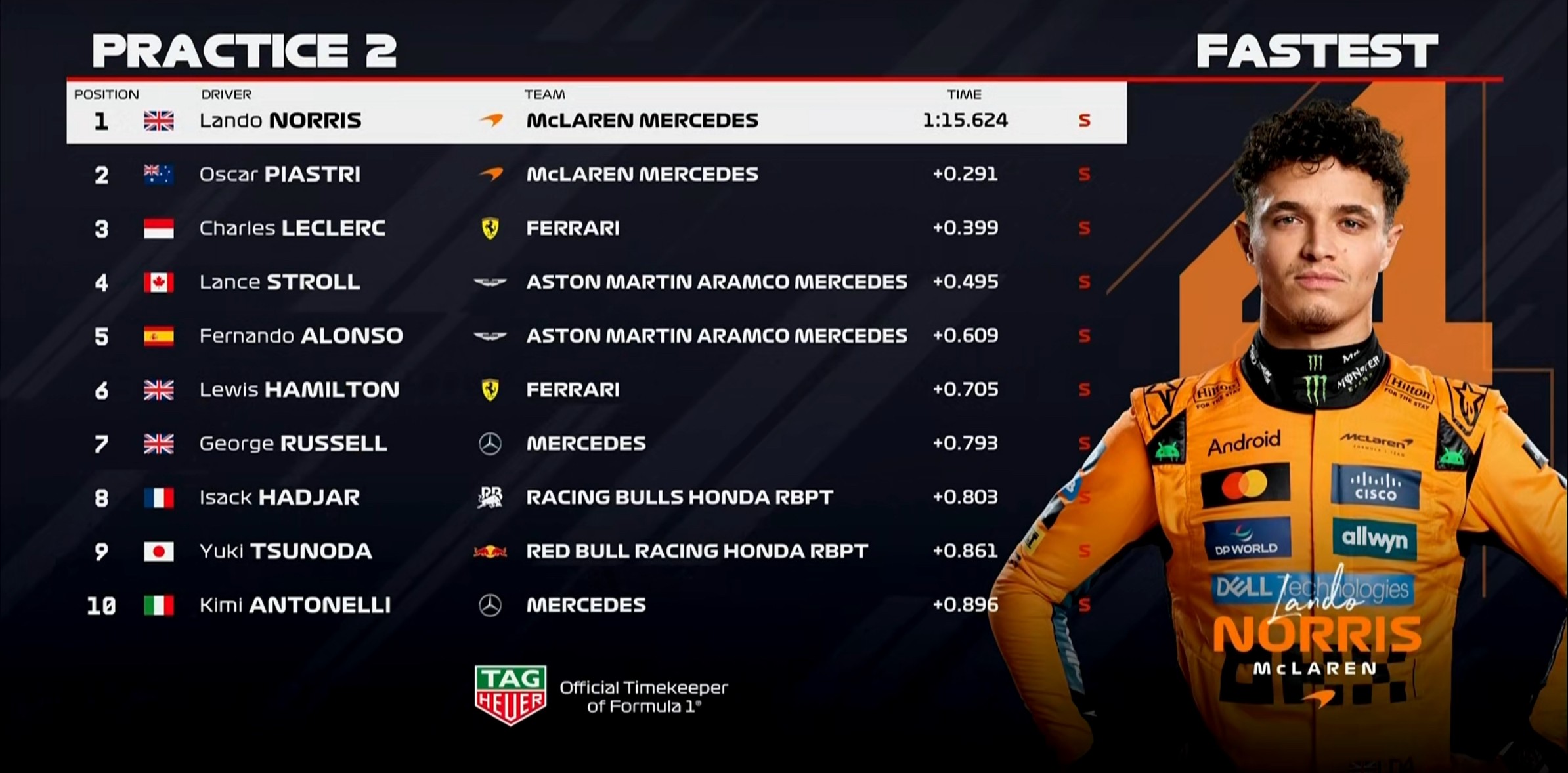 二练进行至10分钟,首轮飞驰圈结束,诺里斯暂居榜首,哈贾尔延续了一练时很好的状态;