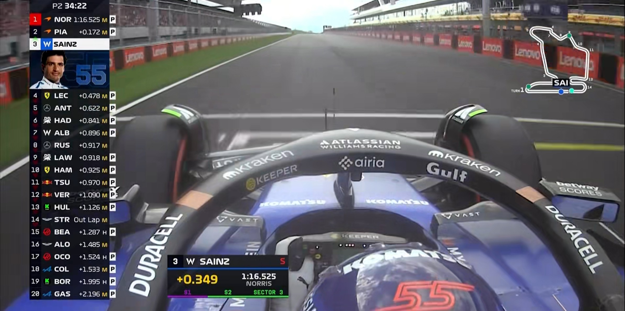 二练时间即将过半,塞恩斯率先完成软胎飞驰圈,落后头名0.349秒排在第3;