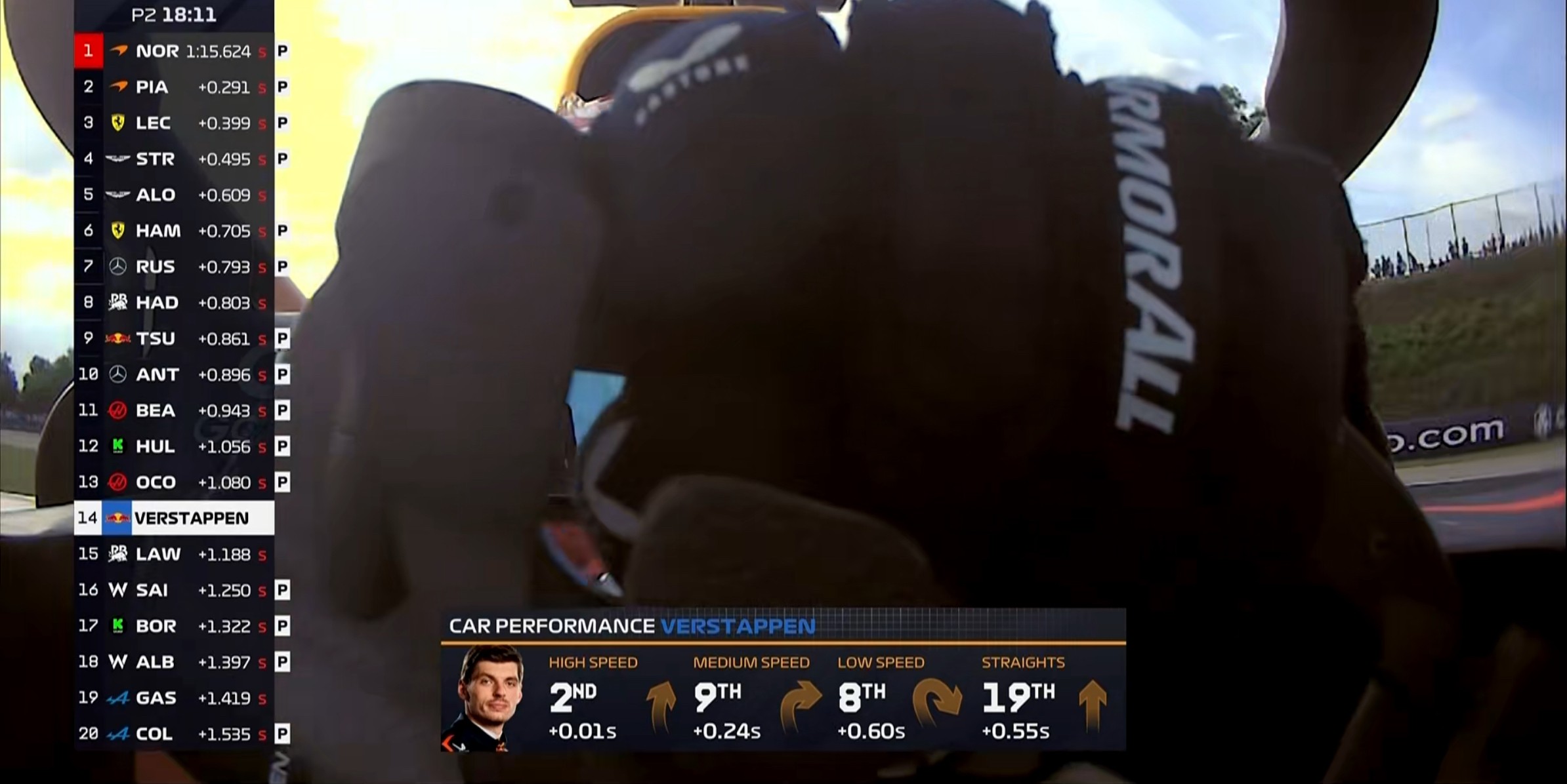 维斯塔潘的软胎成绩较为挣扎,赛车的高下压力调教使得其直道速度接近垫底,飞驰圈的成绩也慢于角田;