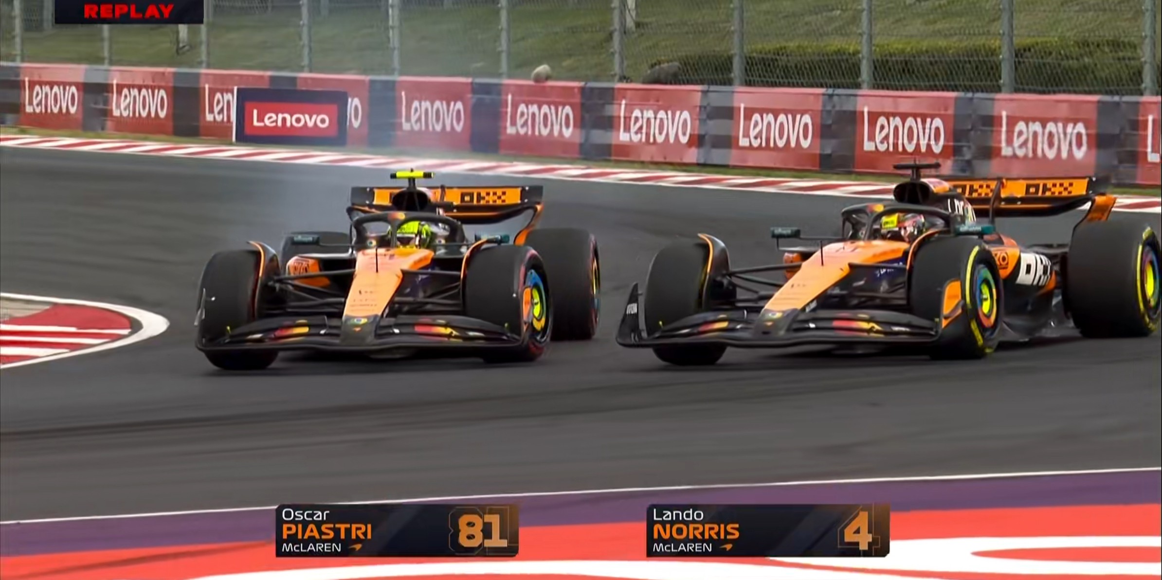 惊险!两台迈凯伦险些在1号弯发生碰撞,刚出维修区的诺里斯正好遇到了入弯的皮亚斯特里!