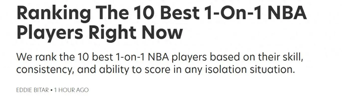 谁是现役1对1单挑之王?在名嘴阿里纳斯在节目中公开透露新赛季NBA全明星有可能增加一对一单挑环节,奖金高达100万美元引起热议后,美媒《fadeawayworld》适时公布现役单挑能力TOP10名单,其中一人力压杜兰特夺魁。
