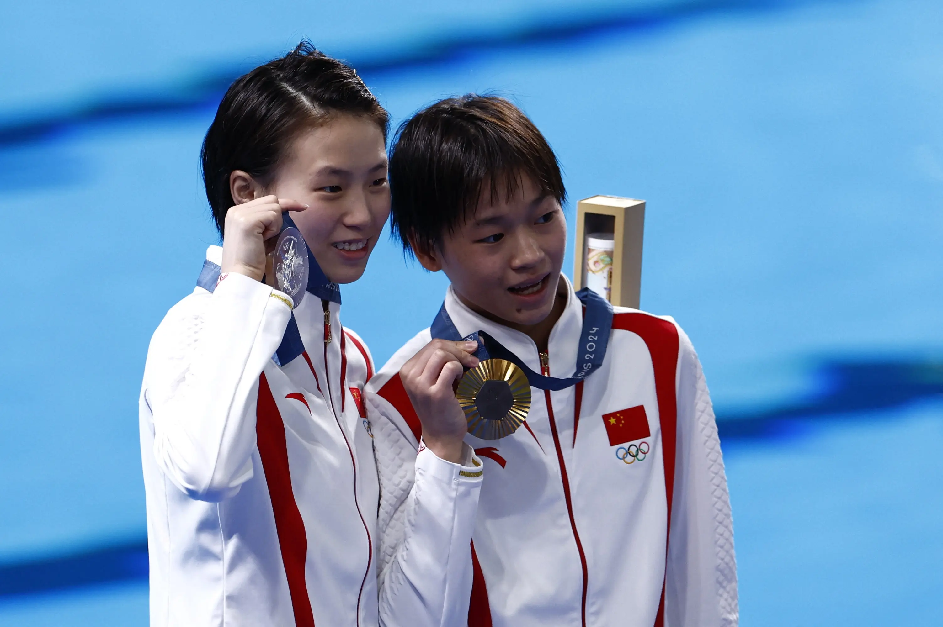 陈芋汐:其实我昨天的预赛,包括今天的半决赛,一直都是在调整自己这样的心态。还是感觉很不一样,包括自己心理上的变化确实是有,但是一方面其实我也相信我队友在决赛中她也是能发挥出自己的水平,尽自己最大全力去努力,另一方面我也就不断的提醒自己,不断的要相信自己是能做到的,我只要专注于自己的比赛,专注自己的动作吧。对于我来说,其实非常感谢团队,中国跳水队,也非常感谢所有支持我的教练,领队啊,因为确实没有他们不断的去帮助我,我走不到今天,我是真的可能在巴黎奥运会后,我可能就放弃了。