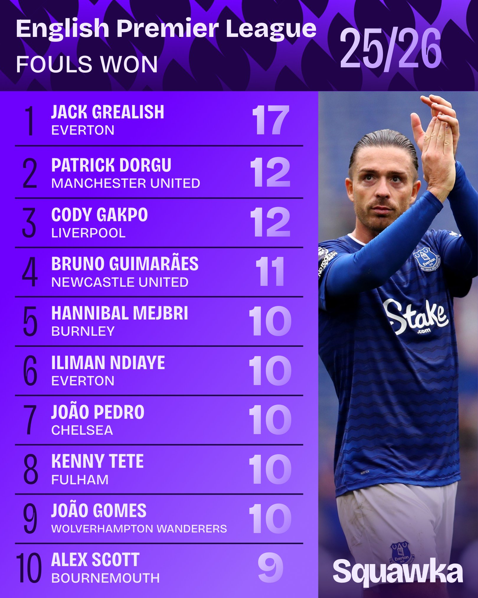 2025/26赛季英超球员被犯规榜: