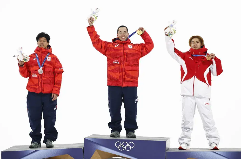 冠军日本选手木村葵来(中)、亚军日本选手木俣椋真(左)和季军中国选手苏翊鸣在颁奖仪式上