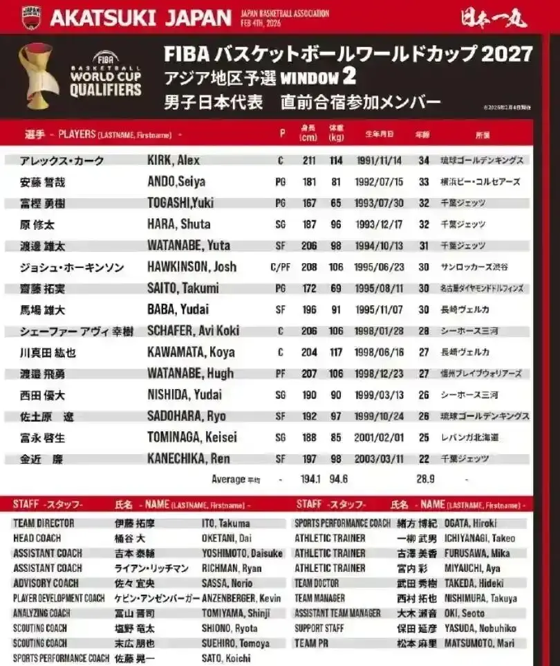 近日,日本男篮公布了世预赛大名单,入选的人员有金近廉、佐木原辽、渡边飞勇、幸树、齐藤拓実、渡边雄太、富坚勇树、阿莱克斯-柯克、富永启生、西田优大、川真田纮也、马场雄大、霍金森、原修太和安藤誓哉。较上一期大名单相比,日本男篮最新一期的世预赛大名单还是有着不小的出入,除了归化球员柯克和霍金森都在列外,还有新入选的渡边雄太。整体来说,日本男篮最新一期的人员深度比上一期的还要雄厚。不过日本男篮也不能高兴早了,从他们公布的世预赛大名单来看,主要核心球员八村塁和河村勇辉都没入选。