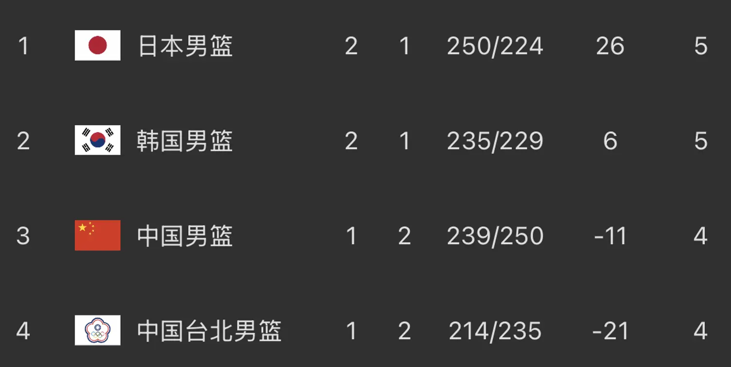 在另一场比赛中,韩国队意外落败,以65-77输给中国台北。在CBA效力的陈盈骏全场13分5板4助,林庭谦18分3板,刘铮10中1,得到3分4板3助3抢断。在目前的小组积分榜上,日本、韩国同为2胜1负,排名前2位,中国队1胜2负第3,中国台北队1胜2负垫底。
